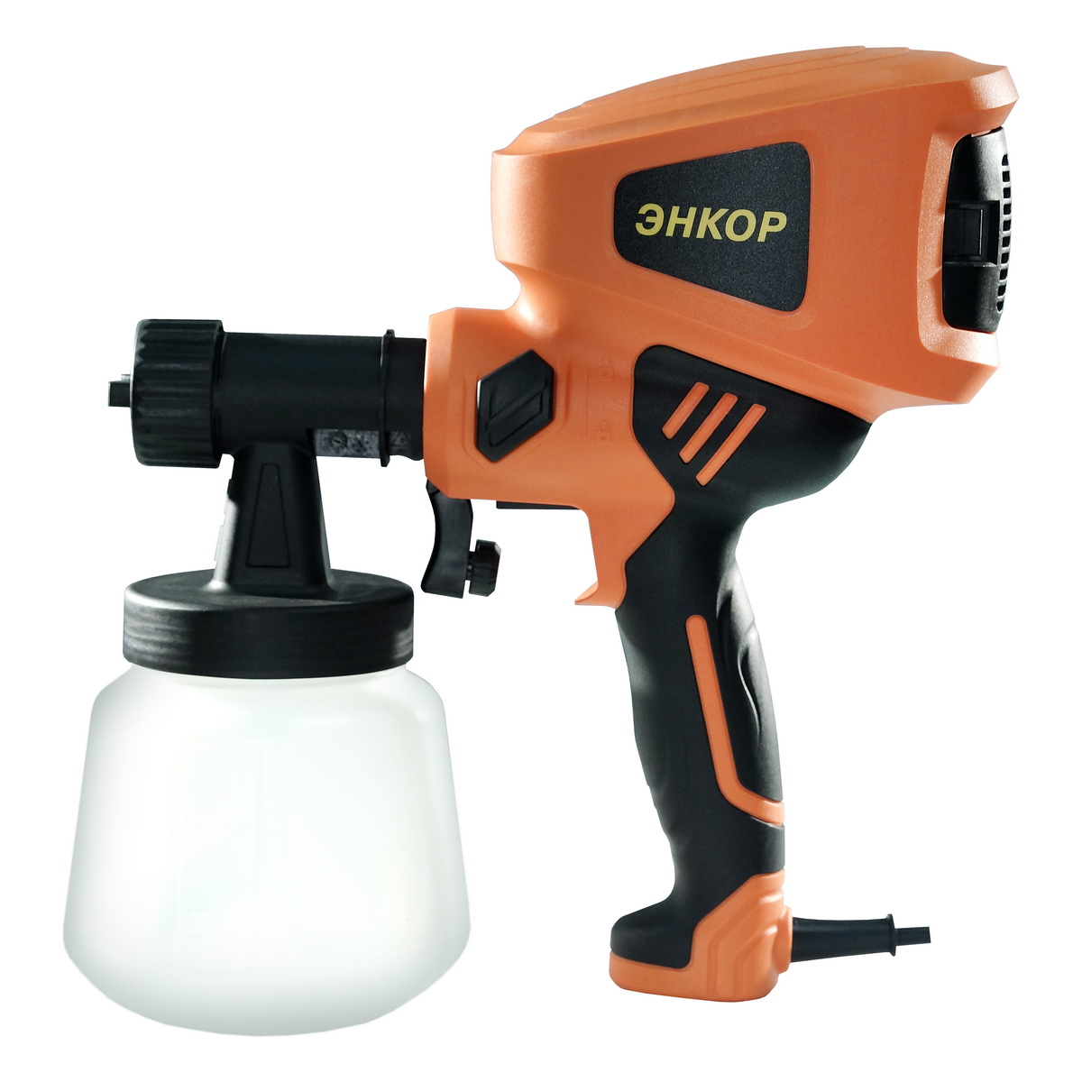 Область применение краскораспылителя разнообразна. Обработка возможна любых поверхностей. Конструкция прибора устроена таким образом, что встроенный компрессор имеет бачок для краски объемом 0.9 литра. Расположение которого определено снизу. Это позволяет увеличить рабочее время. Данная модель может применяться не только в быту, но и в промышленных масштабах. Его зачастую используют при строительных и ремонтных работах. Производительность краскораспылителя Энкор КЭ-400 достигает до 0,7 л/мин., это происходит за счет встроенного компрессора. Подобная конструкция позволяет обрабатывать поверхность большой площади.