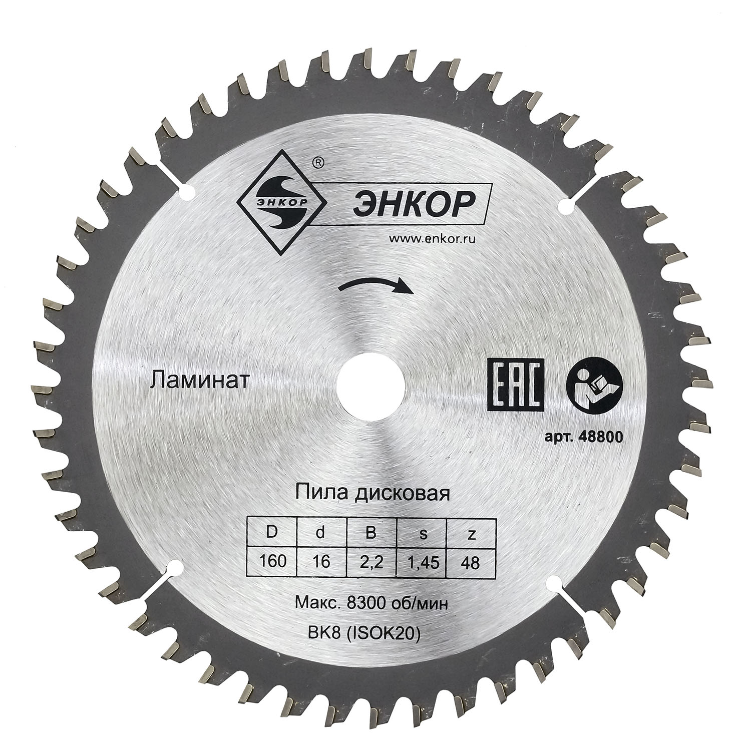 Диск пильный по ламинату (160x16 z48) Энкор 48800 предназначен для распиловки мебельных щитов, ламината и прочих древесных материалов с декоративным покрытием.