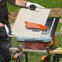 Среди главных особенностей хочется выделить наличие наклонного стола, который сделан из нержавеющей стали. Он полностью защищён от воздействия коррозии. Помогает сделать рез под нужным углом, что даёт возможность провести разноплановые работы. Двигатель, который установлен в нижней части, не мешает работе всего прибора.